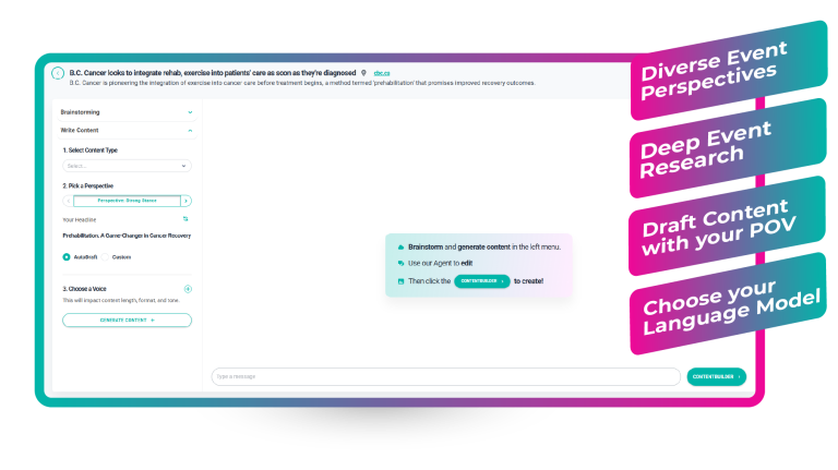 AI AutoDraft delivers research summaries, suggested perspectives, and sourced opinions for every event it detects. Browse through popular points of view, or come up with your own. Autodraft lets you quickly research and develop an informed perspective on any event, and then bake that perspective right into the content you generate.