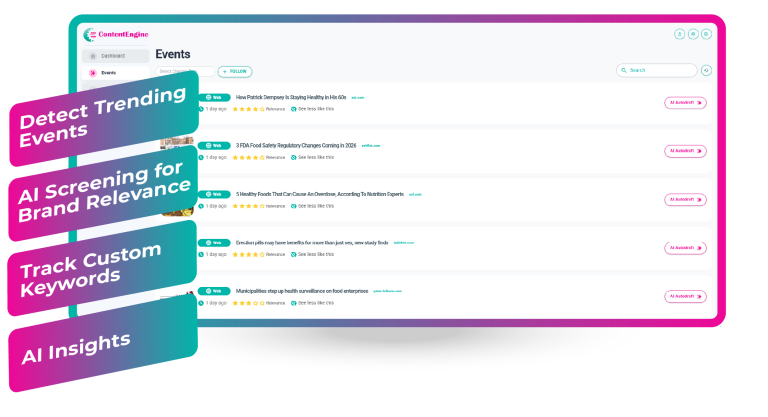Unlike a traditional news feed, ContentEngine uses AI to filter and rank events based on your audience’s interests, showing you only high-impact stories. It prioritizes what your audience will care about. It presents relevant web articles, videos, and social posts alongside context, research, and content-drafting tools to help you respond quickly and effectively.